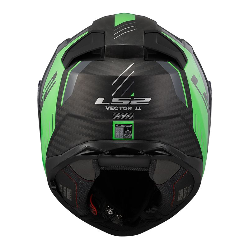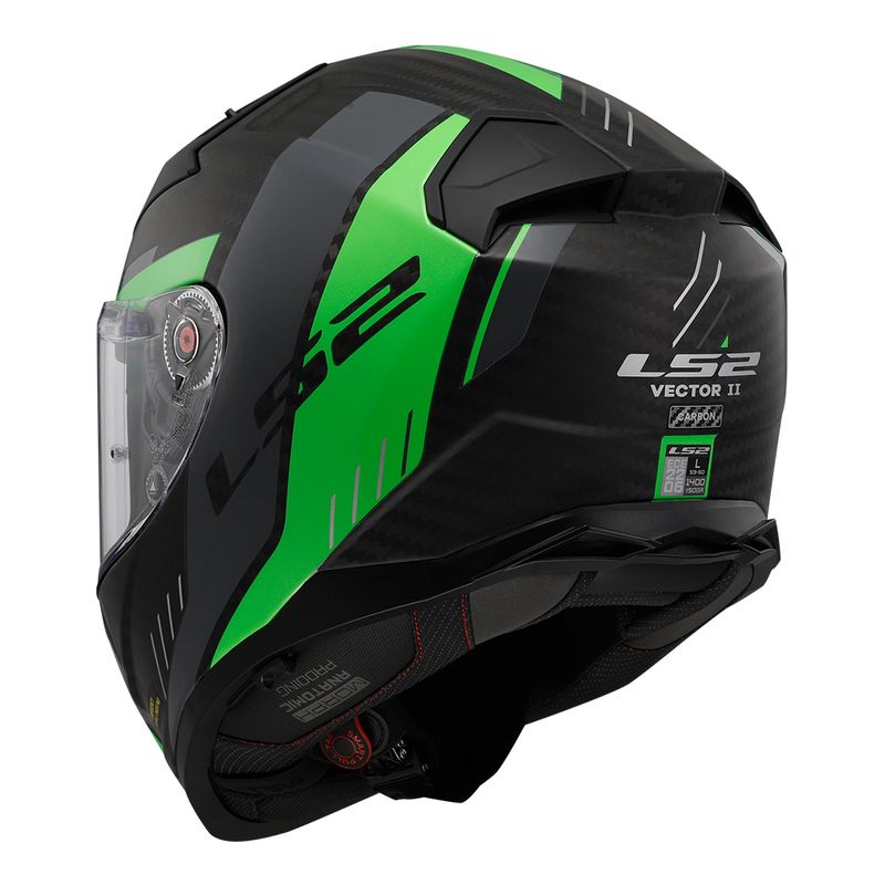 Acompanha uma mochila, viseira fumê e Pinlock® 120 Max Vision. O VECTOR II Carbon é um casco feito em 100% fibra de carbono, fazendo pesar apenas 1400gr (+-50gr). É um capacete versátil e completo, ideal para motociclistas que buscam um equipamento para diversas situações de pilotagem. CARACTERÍSTICAS: • EPS de multidensidade; • Homologação ECE 22.06; • VISEIRA: Tratamento UV, resistente a riscos, 2mm de espessura e sistema de troca rápida; • FORRAÇÃO: Cortado a laser, o forro interno é respirável, antibacteriano e removível para lavagem. A tecnologia XSTATIC® integra 99% de prata metálica na camada superficial da forração, garantindo uma inibição eficaz de germes e a diminuição de odores fortes por um período prolongado; • SEGURANÇA: O sistema de fecho utiliza um engate micrométrico de metal, desenvolvido para garantir a segurança ao travar o capacete, e está diretamente conectado à cinta jugular reforçada; • VENTILAÇÃO: O EPS canaletado proporciona excelente fluxo de ar dentro do capacete, com três entradas de ar frontais e duas saídas de ar traseiras.