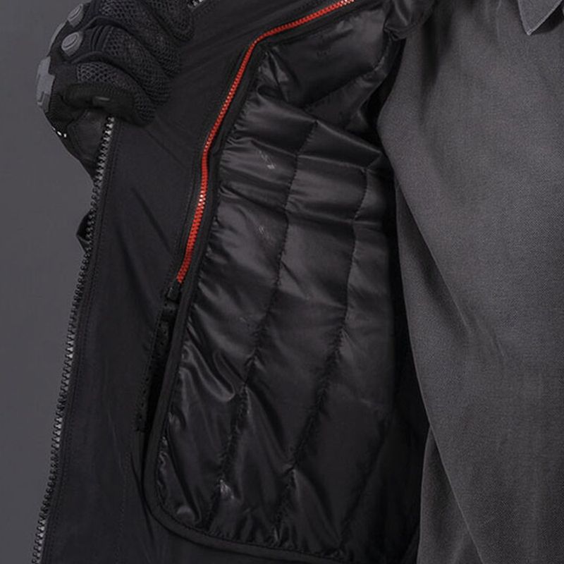 • 2 bolsos laterais, 1 bolso convencional interno e 1 bolso interno impermeável próprio para celular, além de um zíper interno na parte traseira inferior para ligação com a calça;